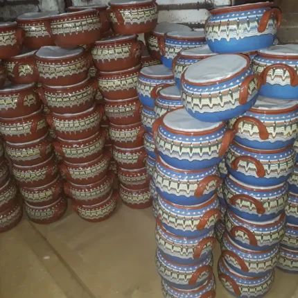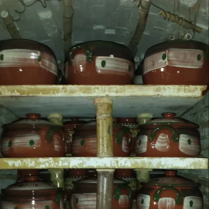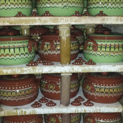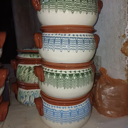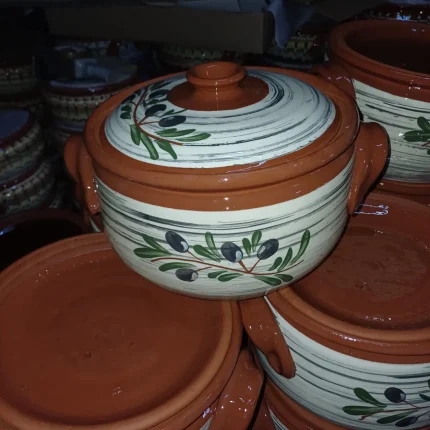We offer white, blue, green, red and brown (traditional). Each product can also be made with decorative poppy and olive patterns.